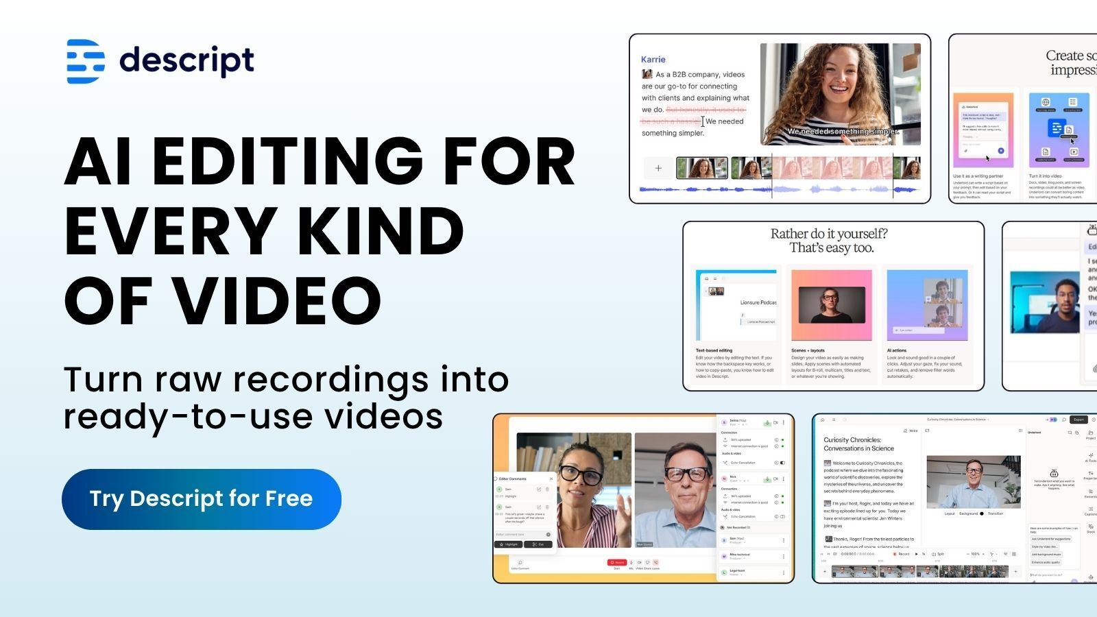 Descript turns video editing into something anyone can do instantly. Just upload your video or record inside Descript in real-time.