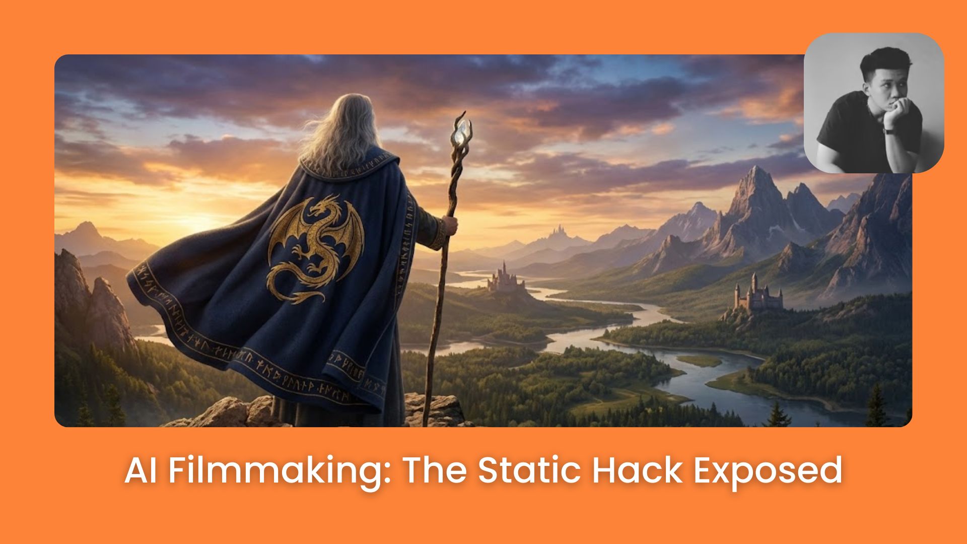The video output youβll see is a smooth camera circle around the wizard. Because we told the AI to look for the golden dragon emblem on his back, the character stays consistent the whole time.