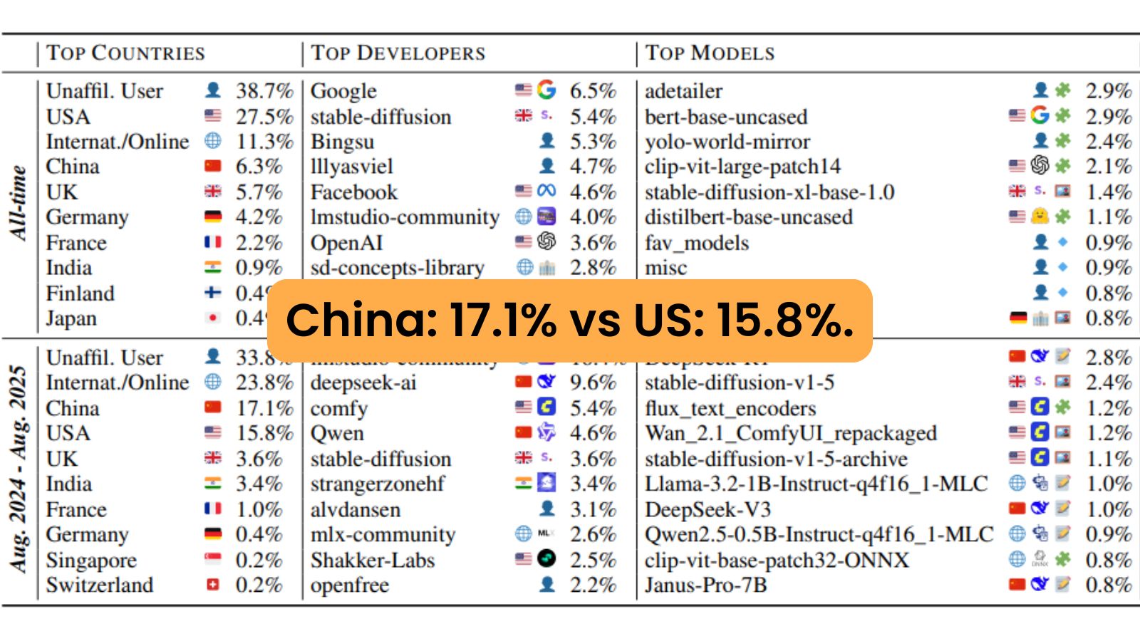 This data covers 2.2 billion Hugging Face downloads from Aug 2024 to Aug 2025, signaling a complete rebalancing of who drives the open AI world.