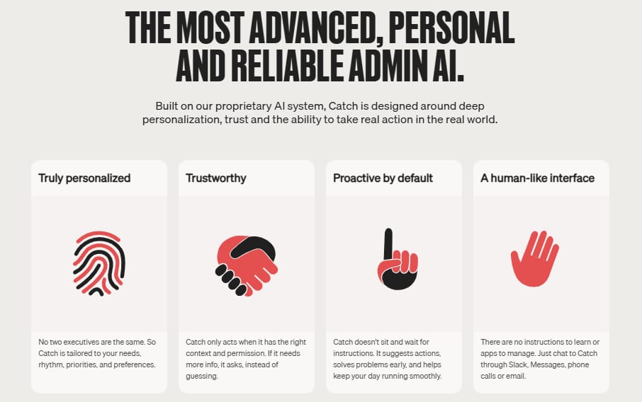 A full-time Executive Assistant costs $60k+. Catch does the heavy lifting for a fraction of the cost, with zero setup.