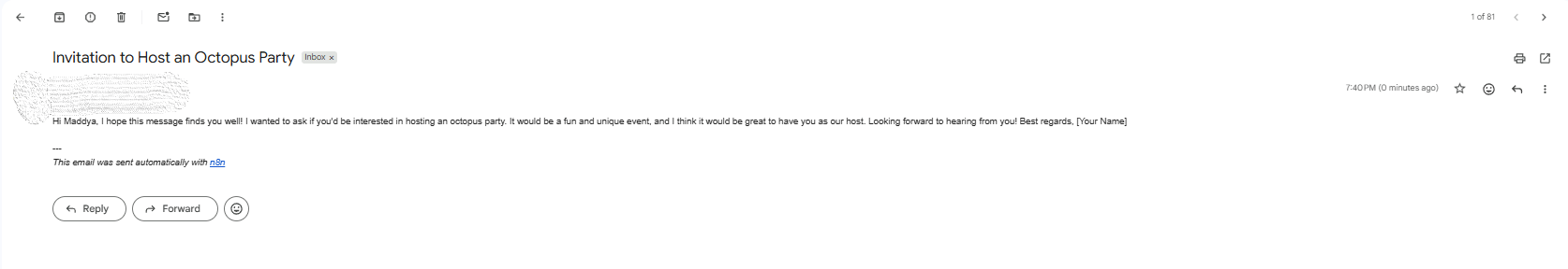 Test: Prompt the AI agent within this second workflow: "Send an email to [email protected] asking her to host an octopus party".